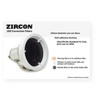 Les filtres Zircon sont dotés de caractéristiques techniques avancées, incluant des gélatines de correction de couleur qui permettent d'obtenir une transmission lumineuse optimale. Ils sont conçus pour être utilisés uniquement avec des sources lumineuses LED, et leur utilisation avec des lampes halogènes ou incandescentes est fortement déconseillée. Les bulles et lignes présentes sur le support autocollant n'affectent pas la couleur, garantissant ainsi une performance constante.