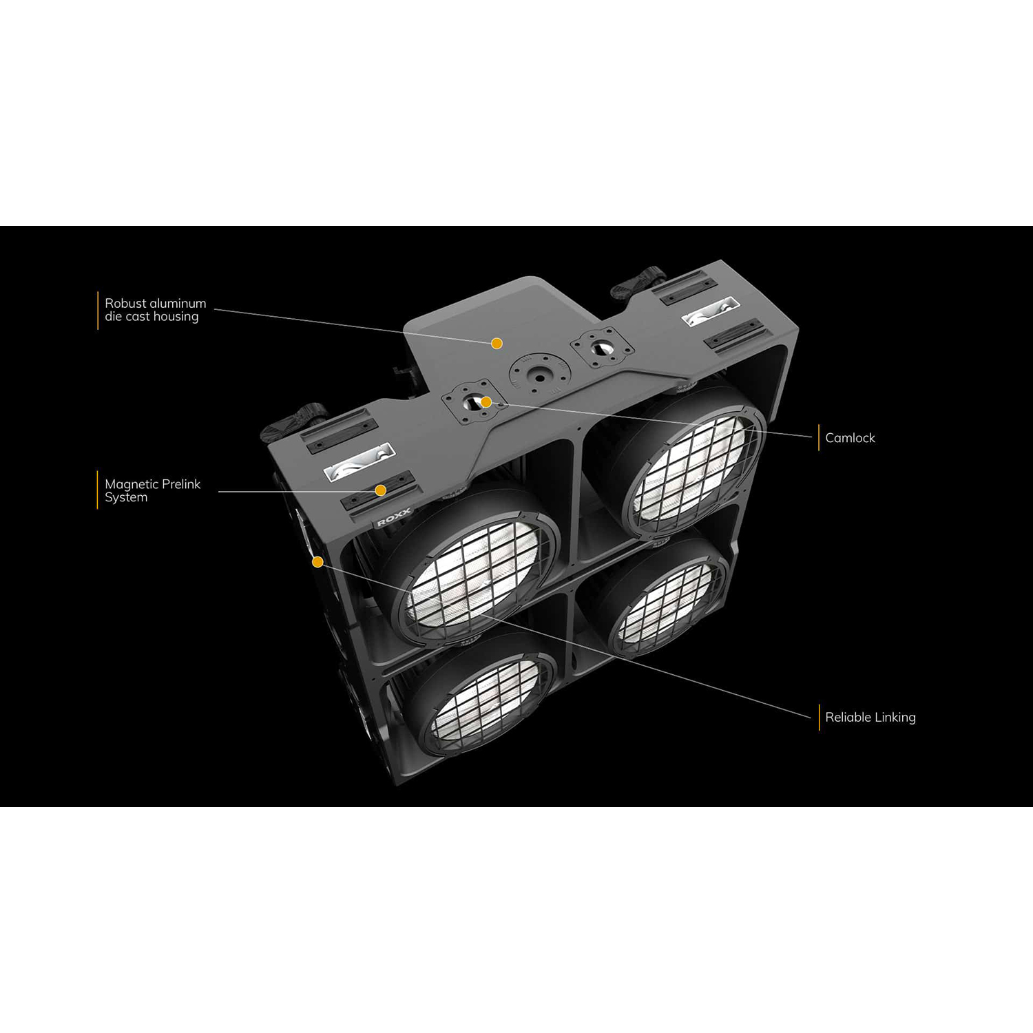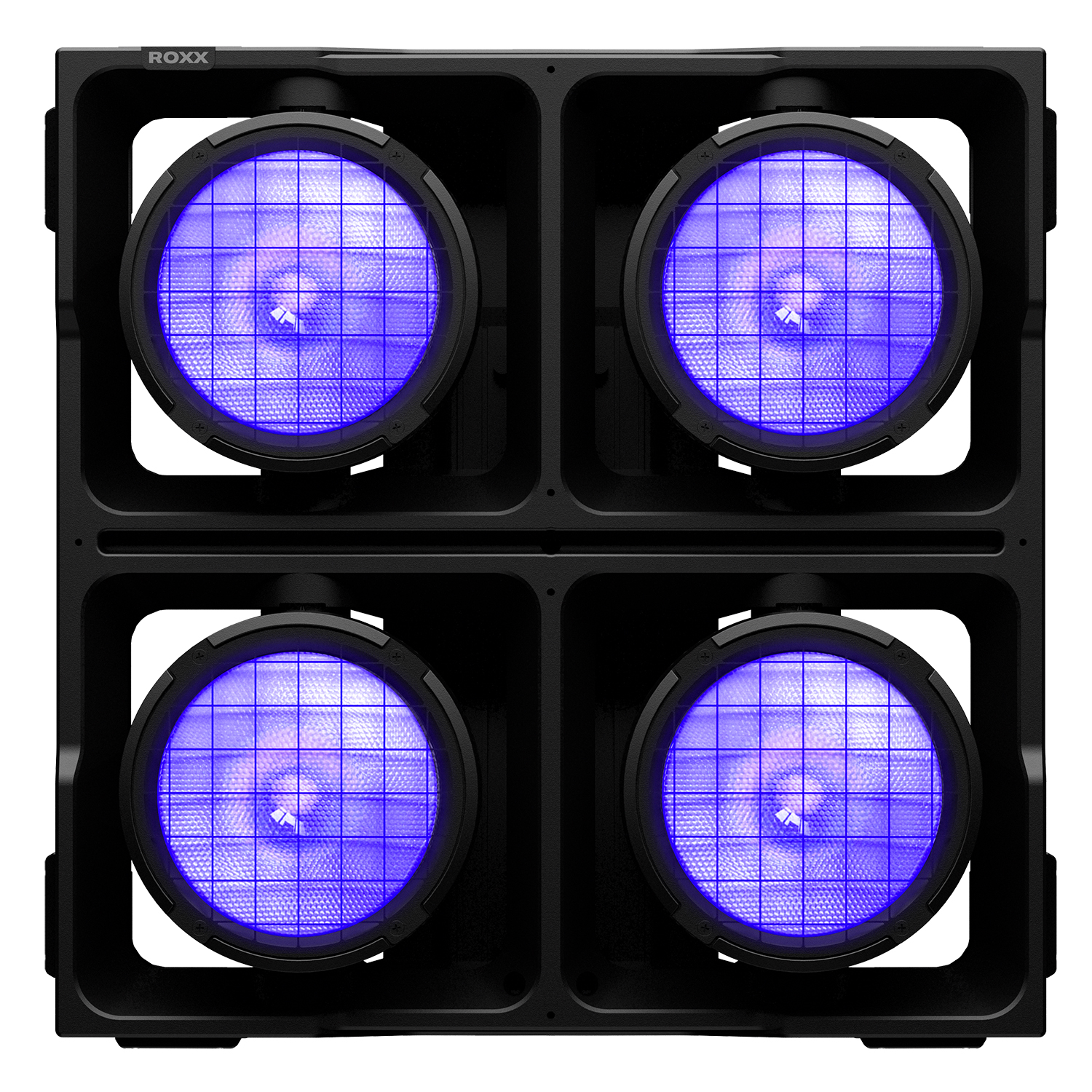 Le ROXX Cluster B4 FC est un blinder LED puissant conçu pour les applications scéniques les plus exigeantes. Doté de quatre sources lumineuses de 300W chacune, il offre une puissance lumineuse impressionnante avec un total de 1200W. Sa conception robuste lui confère une certification IP65, le rendant parfaitement opérationnel et résistant aux intempéries pour les environnements extérieurs. Grâce à sa capacité de mélange de couleurs RGBA + BC (Blanc Chaud), il permet une palette étendue pour des effets visuels dynamiques et des ambiances lumineuses riches.