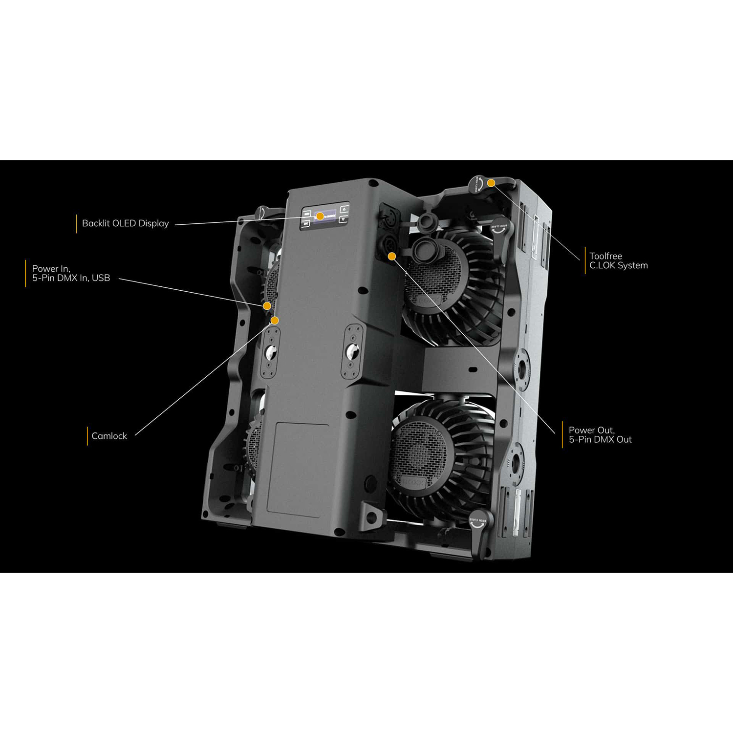 Leds RGB + ambre + blanc chaud Flux lumineux continu : 28300 lumens. Angle d'ouverture : 50°. Multiples systèmes d'accroche : camlock, M12, spigot + système magnétique permettant l'assemblage en tout facilité. Yoke 4.2 incluse.