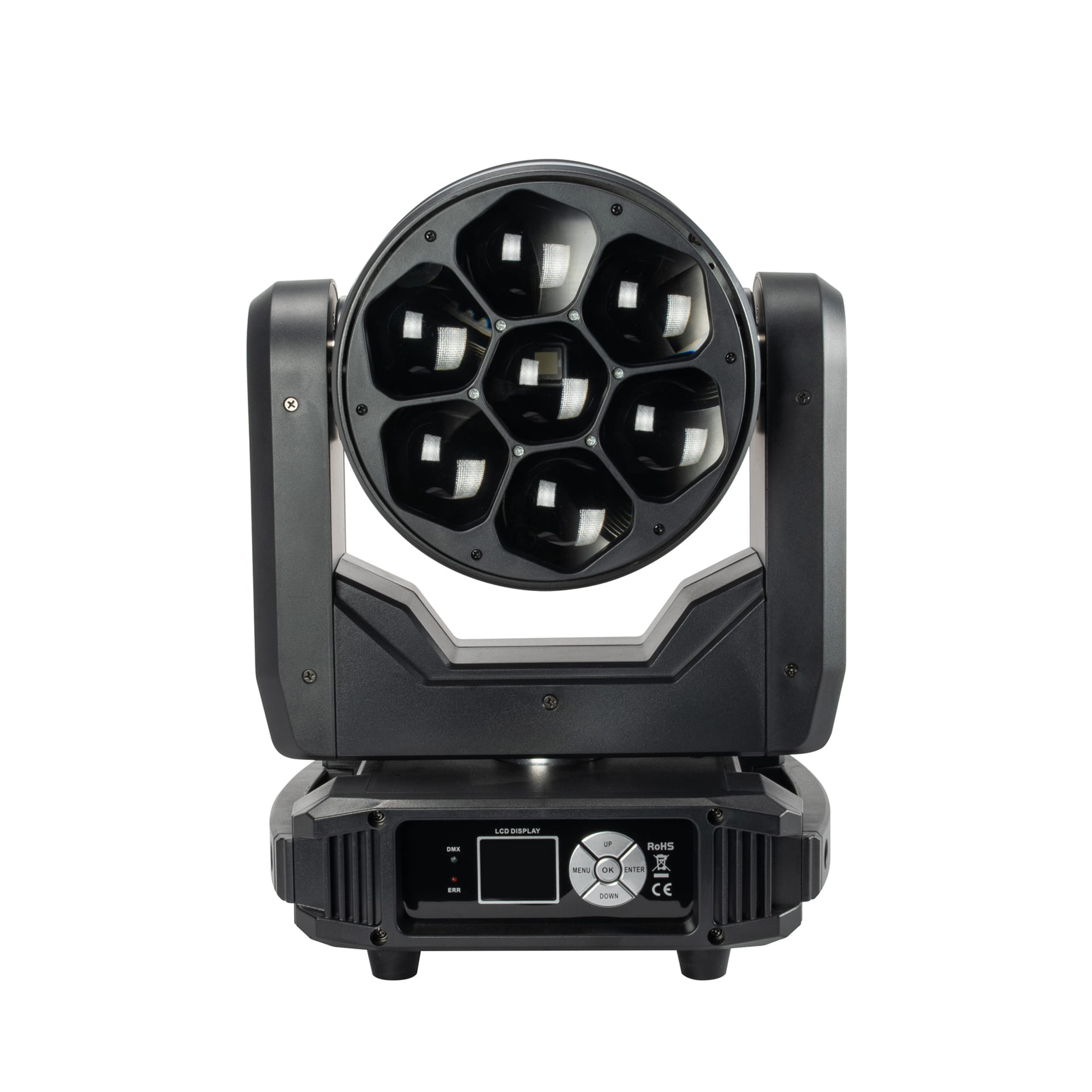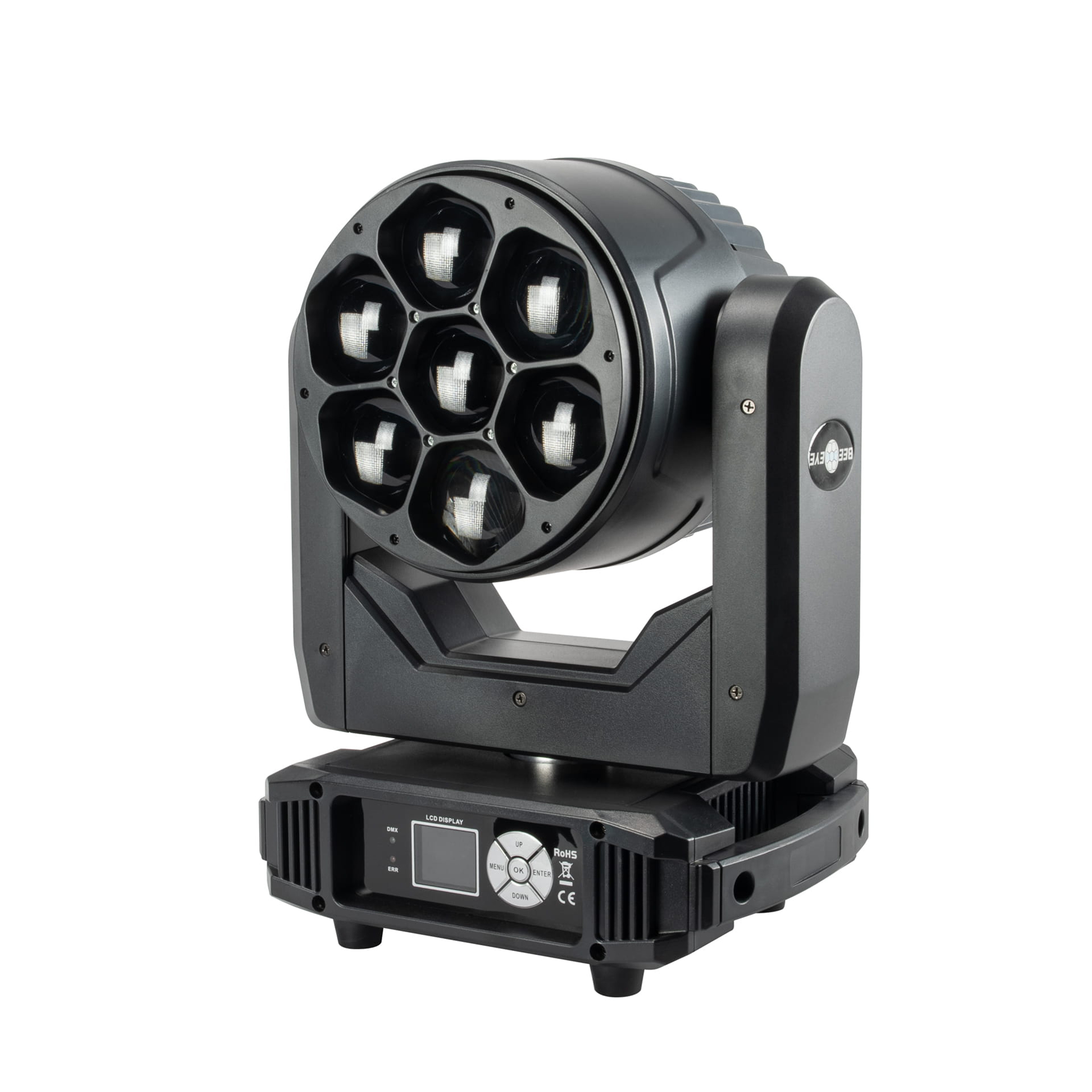Zoom motorisé de 3,5° à 55°. Contrôle pixel by pixel, macros de couleur, effet kaléidoscope, mode 1 led. DMX 3 et 5 pts, Powercon in/out TrueOne.