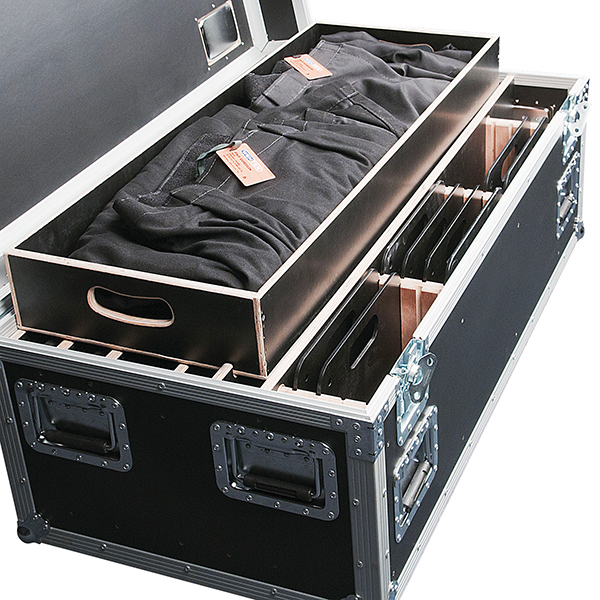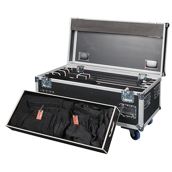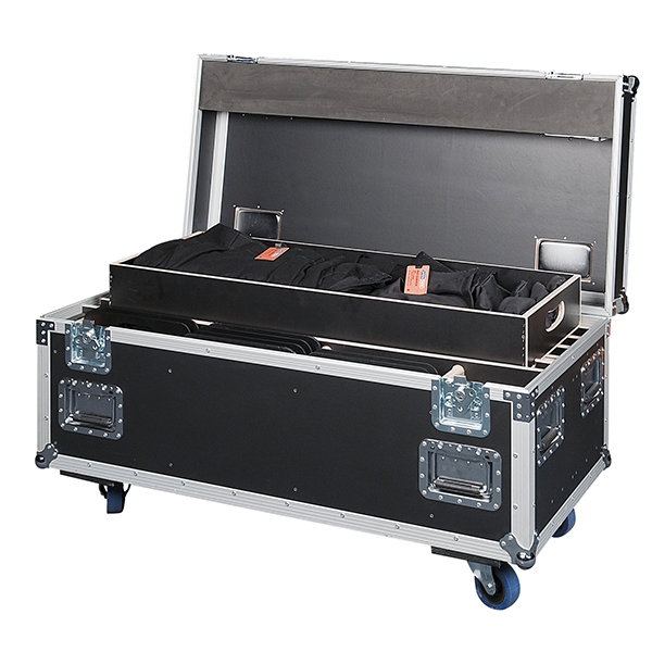 Dimensions (LxlxP) : 1230x665x610mm 4 roulettes diamètre 100mm avec freins - Peut contenir : 12 plaques de base (350 x 350 mm), 12 broches pour plaques de base, 12 montants fixes de 120cm de hauteur, 4 supports télescopiques 90 - 120