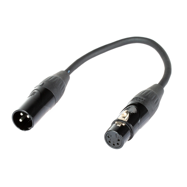 Longueur : 25cm XLR 3 points femelle - XLR 5 points mâle - Exemple d'utilisation : Sortie/Out d'un pupitre/console DMX 5p --> Cordon DMX 3p ou Cordon DMX 5p --> Entrée/In gradateur 3p
