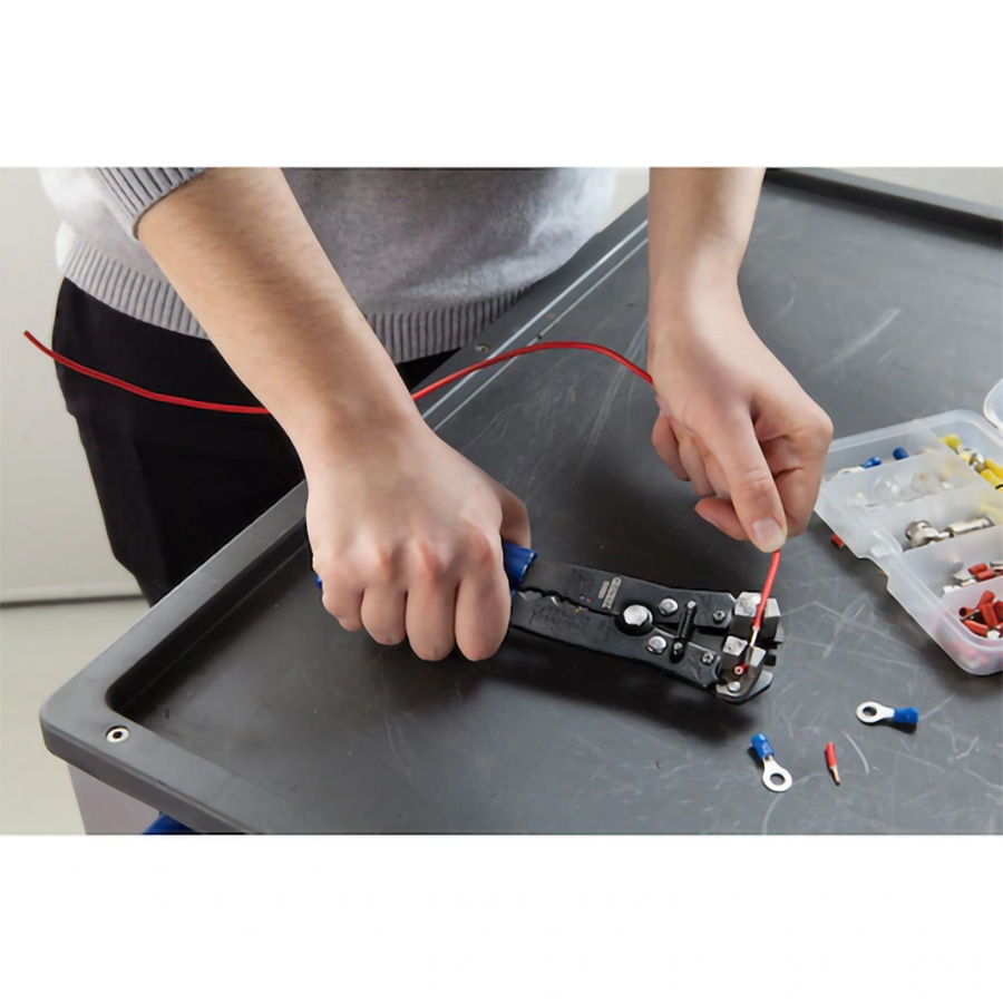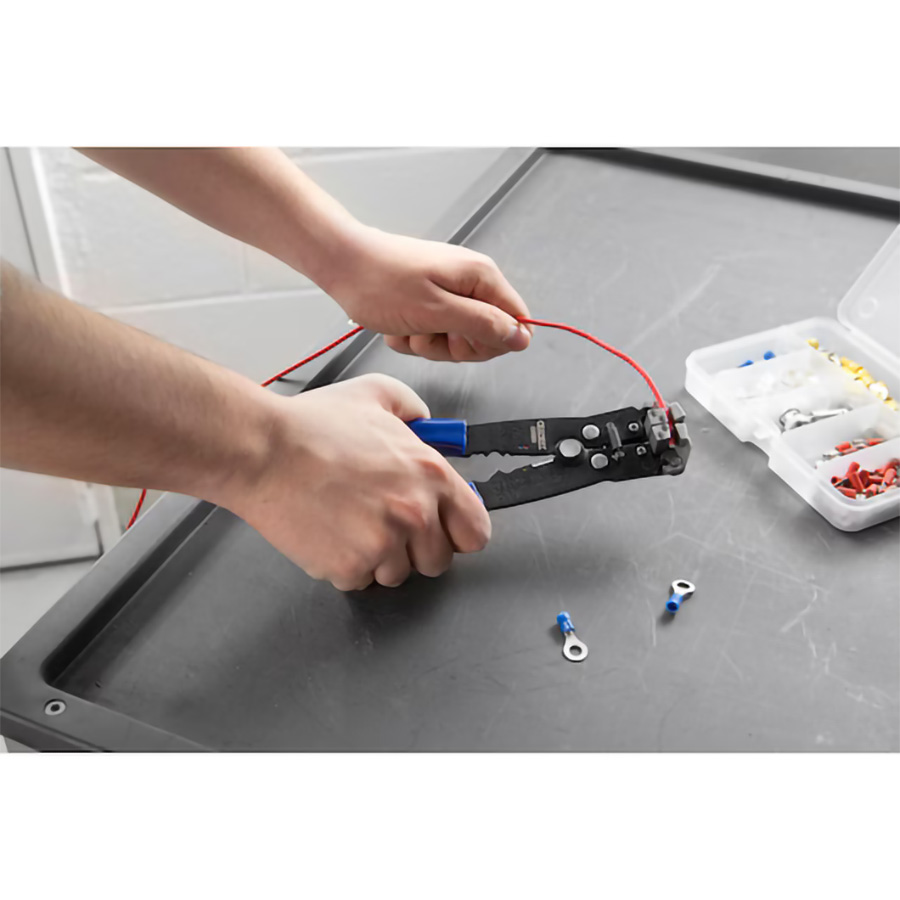 E050105 Sertissage pour cosses pré-isolées : 0,5 à 6mm² - Sertissage pour cosses nues : 0,5 à 2,5mm² et 4 à 6mm² - S'ajuste automatique pour les câbles de 0,2 à 6mm - Fonction coupe file.
