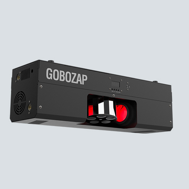 Le GoboZAP est un projecteur LED multieffets intégrant 2 × 90 W sources blanches avec gobos rotatifs. Chaque lentille projette des motifs animés, ajustables en vitesse et direction. L’appareil propose programmes internes, fonctionnement audio et pilotage DMX-512 en plusieurs canaux. La gradation et le stroboscope complètent les possibilités. Le boîtier IP20 est conçu pour montage sur structure avec alimentation secteur.