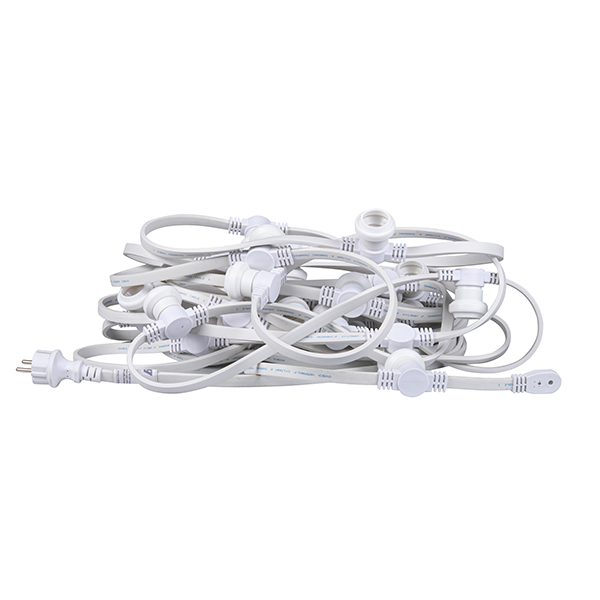 Chaque douille est disposée à intervalles réguliers, facilitant l'éclairage d'espaces variés tels que des jardins, des terrasses ou des événements extérieurs. Les connexions entre les segments de câbles sont réalisées avec des interfaces sécurisées, minimisant les risques de court-circuit. La puissance maximale supportée par la guirlande est de 230 volts, ce qui permet une utilisation flexible selon les besoins d'éclairage.