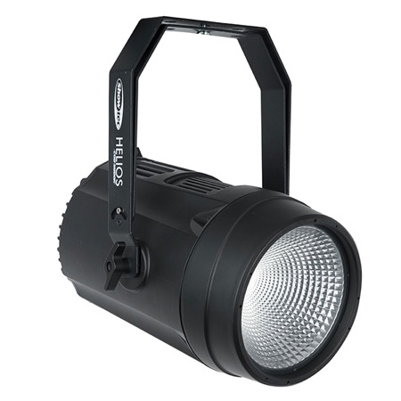 L'interface de contrôle inclut un système de gradabilité permettant d'ajuster l'intensité lumineuse de 0 à 100%. Le projecteur dispose également d'un contrôle DMX complet, facilitant son intégration dans des systèmes d'éclairage complexes. Pour des configurations plus simples, le Helios COB peut fonctionner de manière autonome sans nécessiter de connexion DMX, ce qui le rend versatile et facile à utiliser.