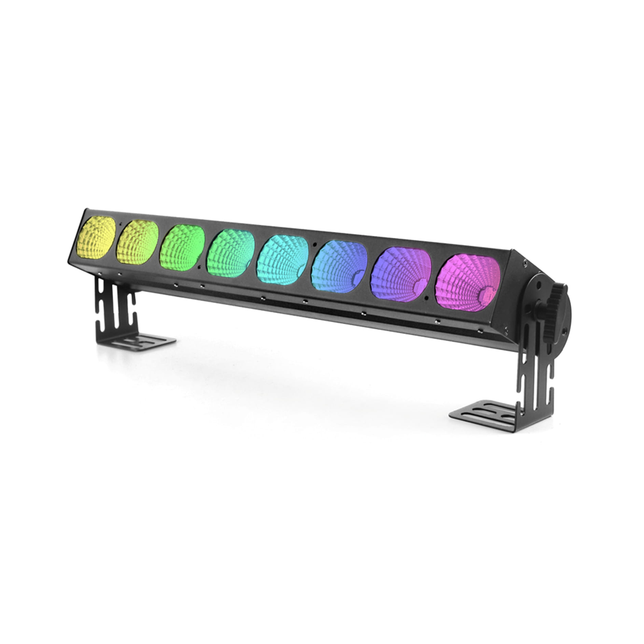 Cette barre LED COB intègre 8 × 30 W en RGBW, contrôlables pixel by pixel. Chaque source peut être adressée individuellement, permettant des chases, séquences dynamiques et dégradés évolutifs. Le pilotage via DMX-512 propose plusieurs modes de canaux pour contrôler intensité, couleurs et transitions. La gradation haute résolution conserve des fondus fluides. L’optique diffuse un faisceau homogène, adapté aux fonds de scène et projections décoratives. Le boîtier métallique robuste optimise la dissipation thermique et garantit une fiabilité en prestation intensive.