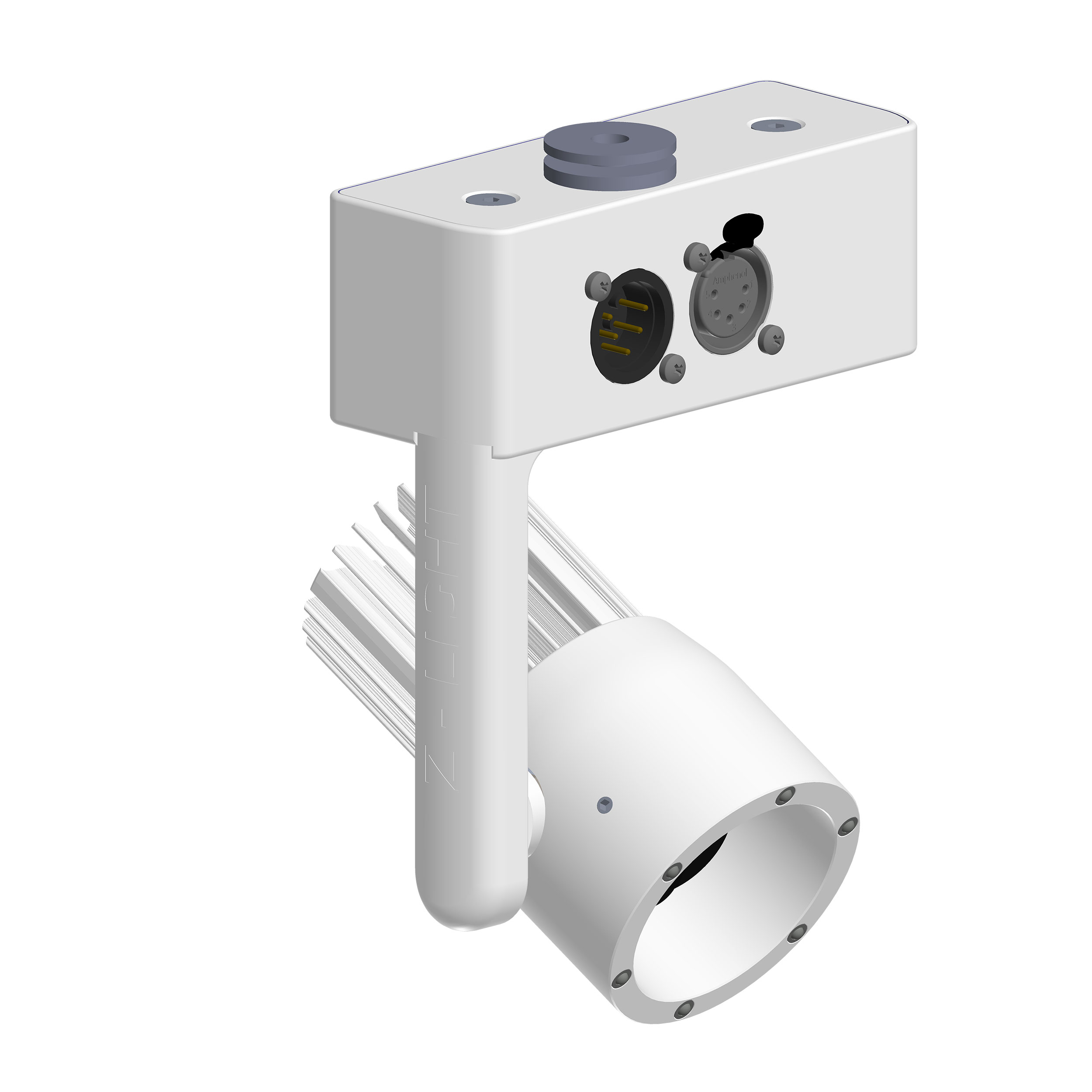 Blanc - Lyre Percée IRC =/>97 - Livré sans optique PC Mickey ou cadreur, mini découpe - Contrôle DMX RDM In/Out XLR 3 - Livré avec cordon monté sur presse étoupe non fiché