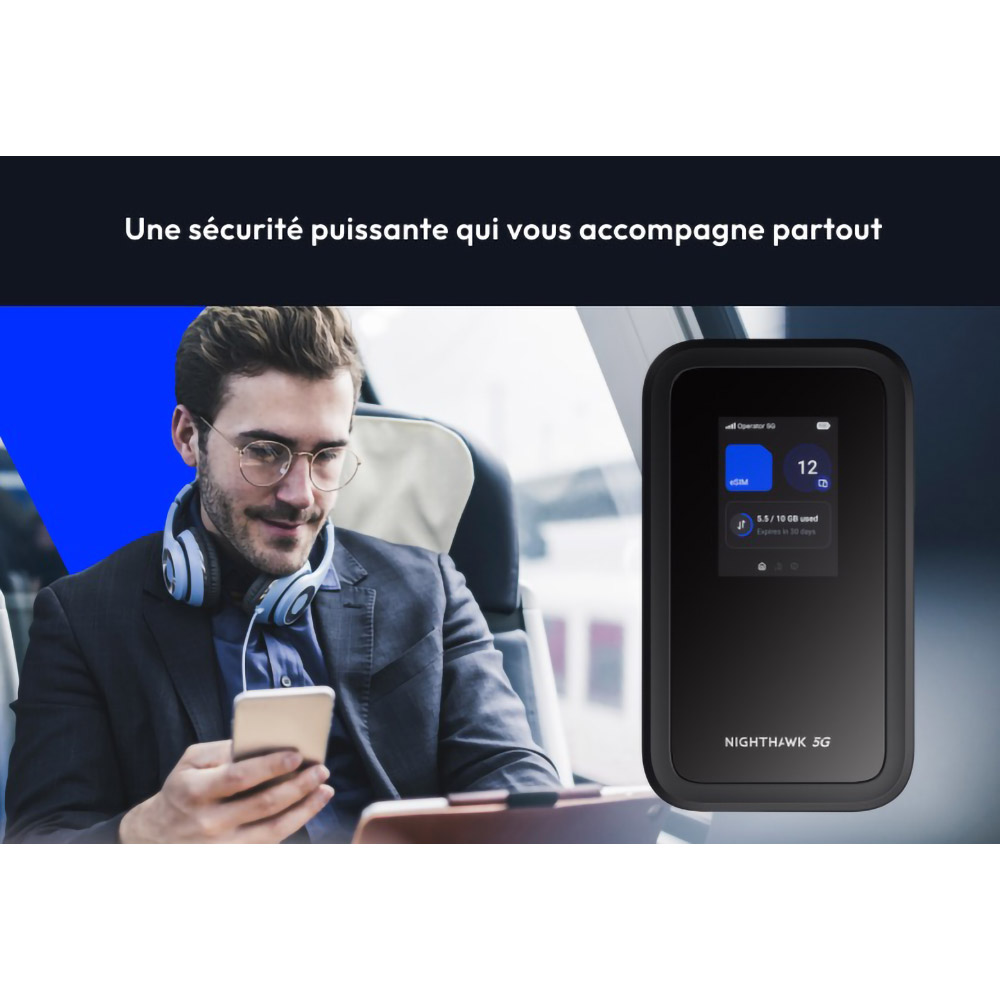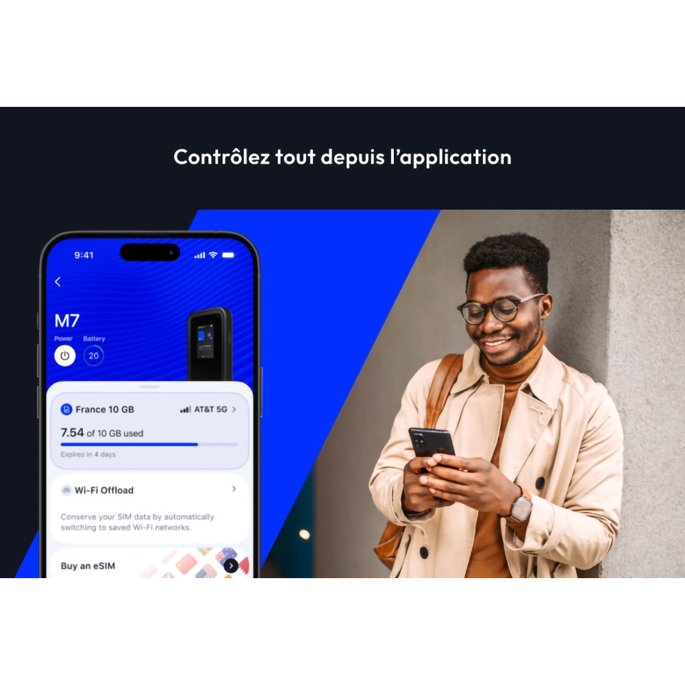 Profitez d'une connexion WiFi 7 ultra-rapide avec une sécurité et une confidentialité renforcée, où que vous soyez, grâce à la puissance de la 5G. Insérez la SIM de votre opérateur ou achetez un forfait eSIM directement depuis notre application mobile intuitive et connectez-vous instantanément aux réseaux 5G/4G dans plus de 140 pays, sans contrainte et engagement. Egalement compatible avec les opérateurs eSIM de votre choix. Profitez de la liberté de rester connecté selon vos propres conditions.