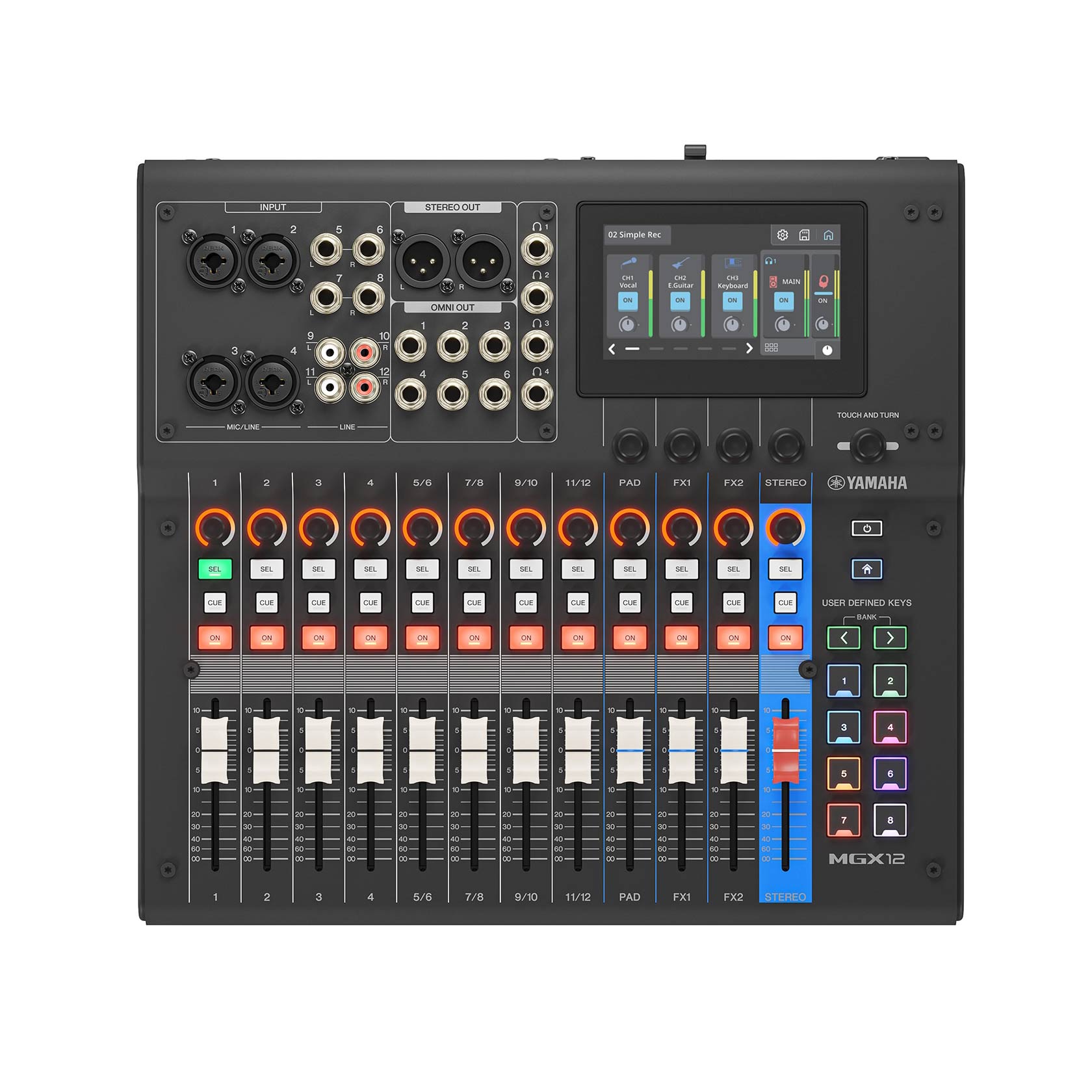 La Yamaha MGX12 est une console de mixage numérique compacte conçue pour la sonorisation live, le streaming et la production audio. Elle intègre 12 faders 60 mm, 4 entrées combo micro/ligne, 4 canaux stéréo et un Sound Pad dédié. Son écran tactile 4,3 pouces, ses encodeurs personnalisables et son DSP intégré permettent un contrôle précis avec EQ, compression, reverb et autres effets. Les préamplis micro Premium offrent une plage de gain de 86 dB et une restitution fidèle.