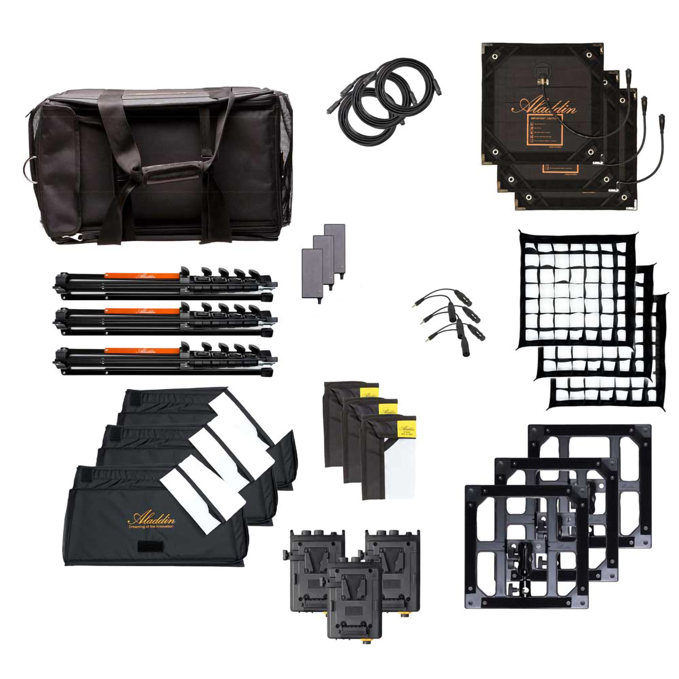 Livré avec 3x Pied 3x Cable 3m 3x ALL-IN 1 ACAD 3x ALL-IN BHAD-F 3x Cadre 1x Diffuseur 3x Softbox et Louver 1x Sac de transport 3x Adaptateur DMX 3x Contrôleur avec Lumenradio