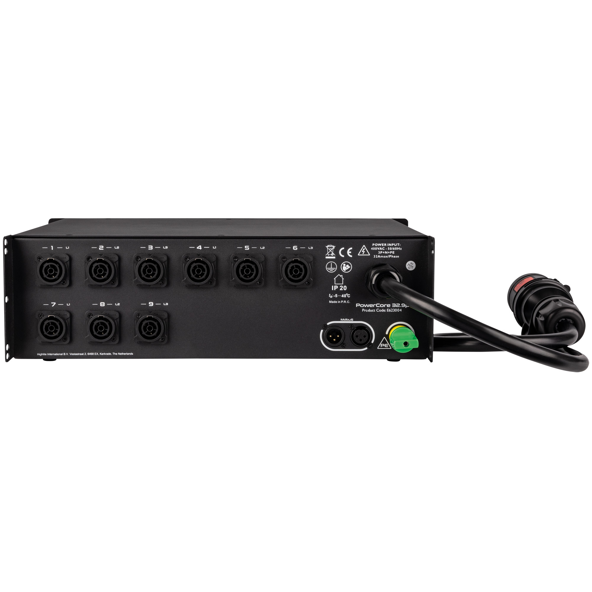 Entrée : P17 32A 5p. Sorties : 9 x True One M + schuko en façade. Borne de mise à la terre incluse. Indicateur en led + écran de contrôle des tensions, des puissances et des phases.