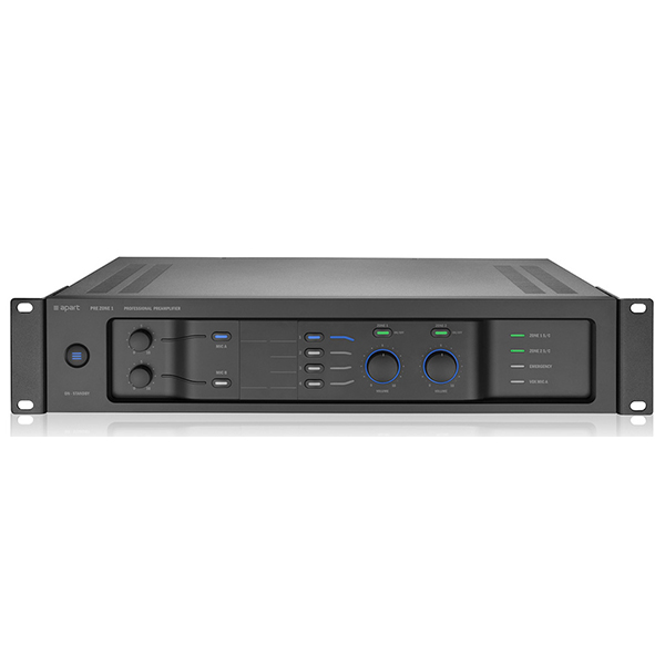 Rackable 2U Entrée prioritaire sur bornier. 2 entrées MIC/LINE bornier/RCA. 4 entrées LINE RCA. 2 sorties stéréo indépendantes avec EQ 2 bandes. Réglage du volume de chaque zone indépendant.