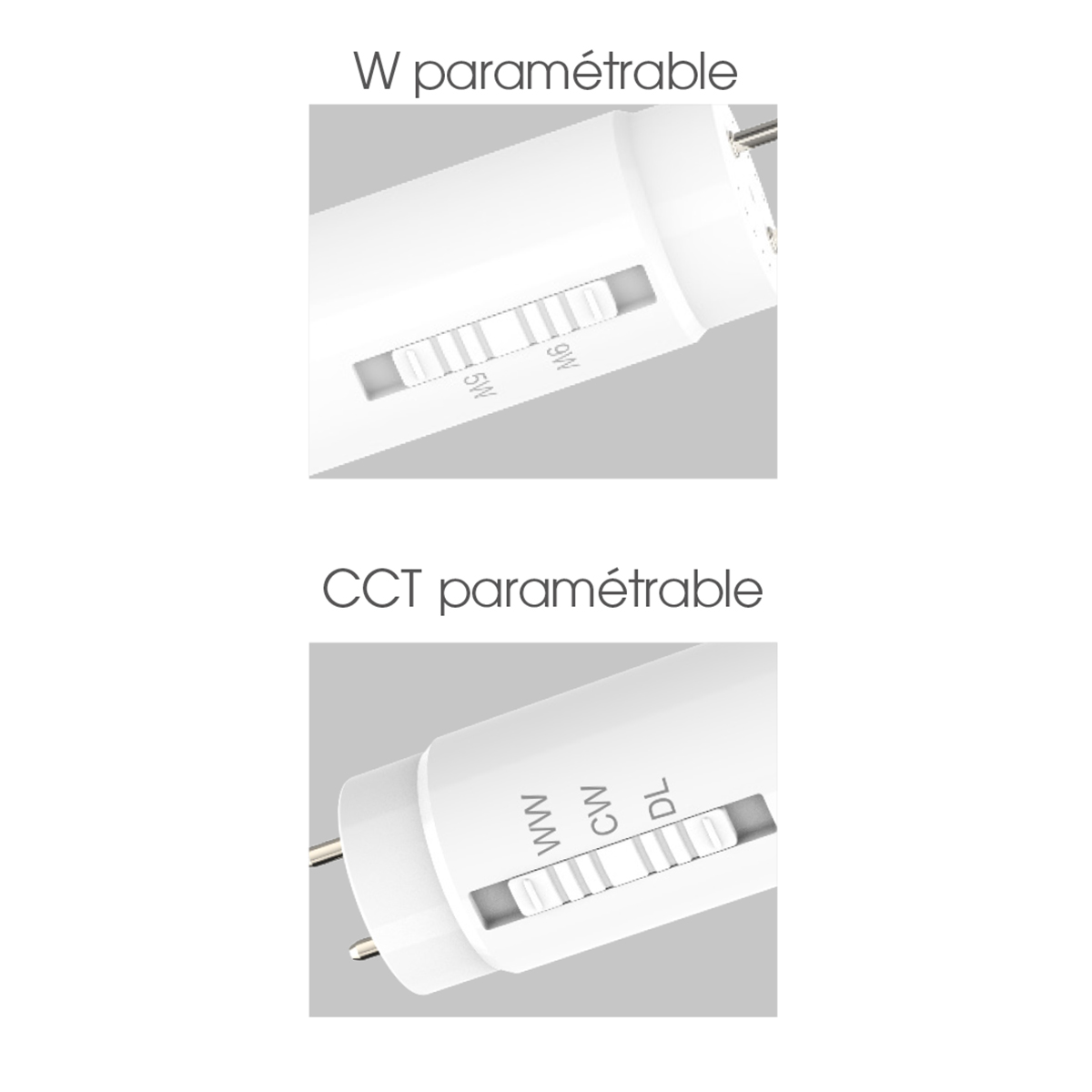 Flux lumineux : 1260 - 2450 lumens. Durée de vie 50000h. Switch pour réglage puissance et switch pour réglage de la température de couleur (3000K/4000K/6500K).