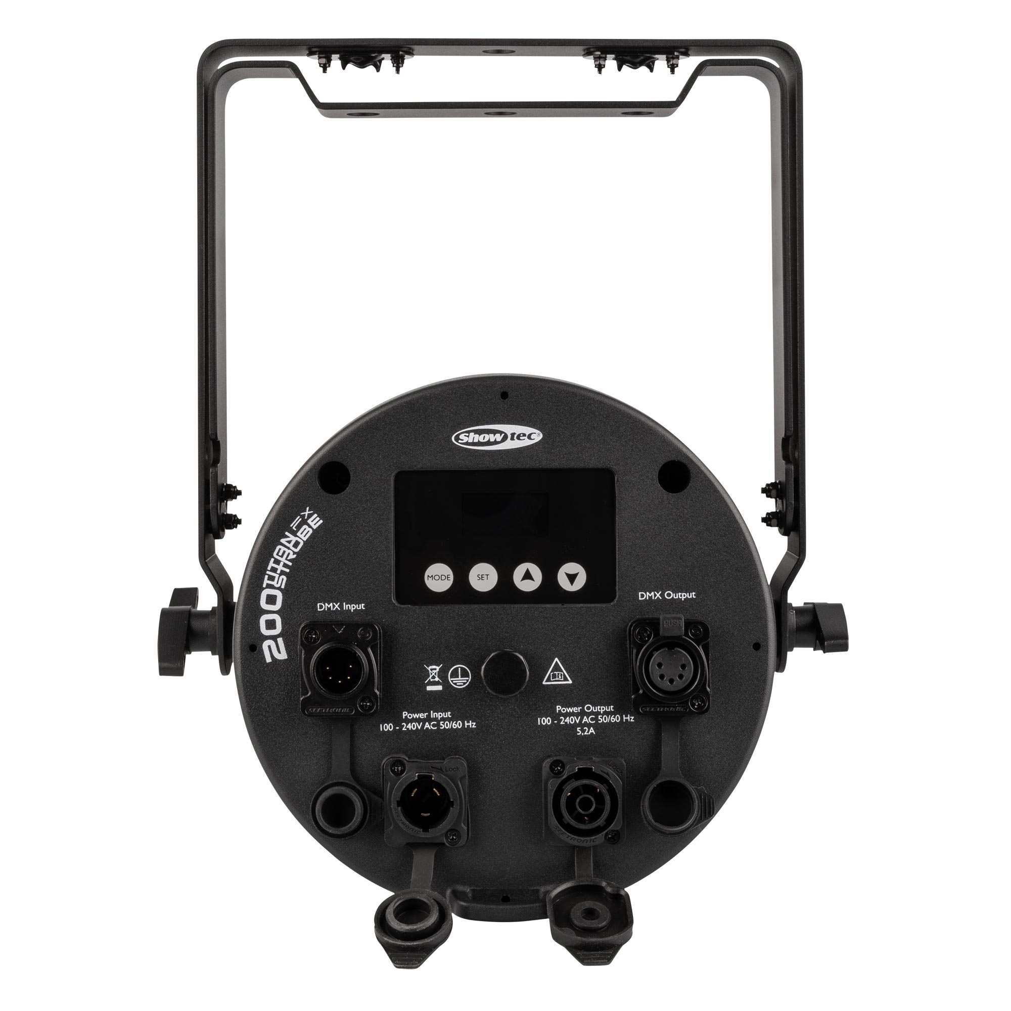 Connexion : alim True One in/out, DMX 5 pts. Double lyre avec accroche oméga.