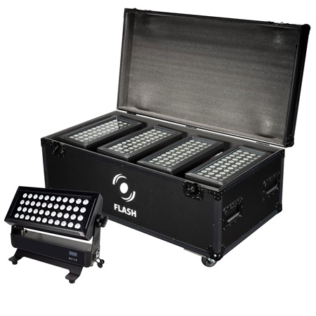La connectique étanche inclut entrées/sorties XLR DMX et alimentation verrouillable. L’interface locale permet l’adressage et le choix des profils. Le flight-case compartimenté protège les appareils et simplifie la mise en place. La matrice RGBWAUV produit saturés, ambres, blancs équilibrés et effets UV adaptés à des surfaces réactives. Les points d’accroche standard permettent une fixation sur truss ou en façade. La gestion thermique intégrée maintient la stabilité de la source en exploitation prolongée. Cet ensemble constitue une solution professionnelle polyvalente pour l’éclairage décoratif, scénique ou architectural nécessitant puissance, résistance et fiabilité.