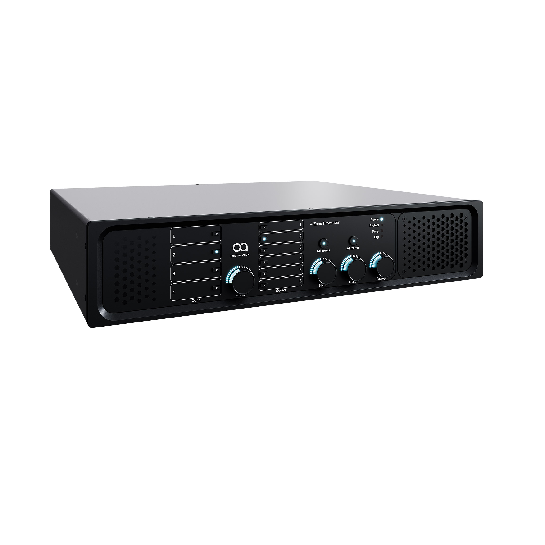 Amplification : 4 x 100W 4/8 Ohms 2 entrées micro avec alim fantôme 48V (borniers), 4 entrées stéréo ligne sur RCA (SPDIF sur ligne 1), 2 entrées HDMI avec sorties through. Contrôle mural via ZONEPAD ou webAPP, DSP intégré.