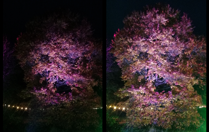 Éclairage sans OPTI-SCULPT (G) – Éclairage d'une plus grande partie de l'arbre